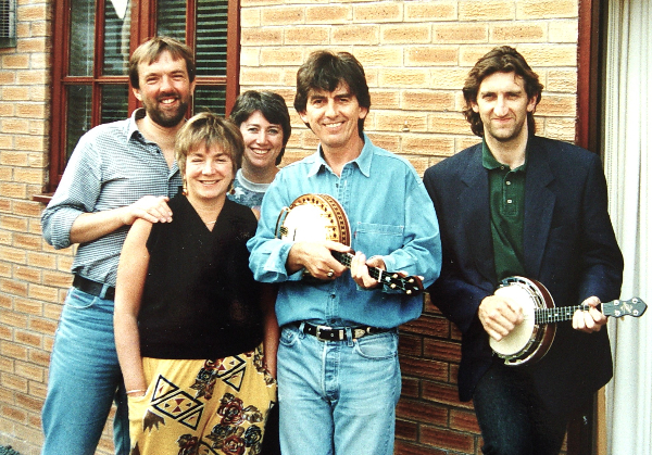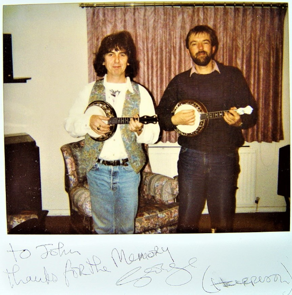 Over the next eleven years, I visited (and stayed!) with George at his home, Friar Park, near Henley-on-Thames, on a number of occasions, and he even came to stay overnight with Mary and I in Llanyblodwel – where, at his suggestion, we went for a short drink at ‘The Horseshoe’. To our amazement, we were invited to Portmeirion Hotel for part of the filming of ‘The Beatles Anthology’. During one visit to Friar Park, George gave me the most beautiful vintage Gibson Banjolele – which I treasure. It always seemed really strange that a schoolteacher from Oswestry would become friends with one of the most famous people in the world”.