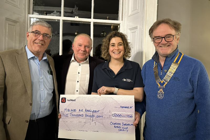 Borderland Rotary Club is proud of its history of fundraising for Midlands Air Ambulance Charity over the past 30 years from the proceeds of the Borderland Mountain Bike Challenge, and this year presented Pip Machin from Midlands Air Ambulance Charity with a cheque for £5,000.