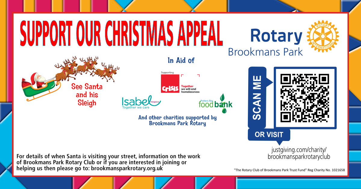 We will be out and about with our Sleigh in December raising funds for Crisis at Christmas and other charities supported by Brookmans Park Rotary.
