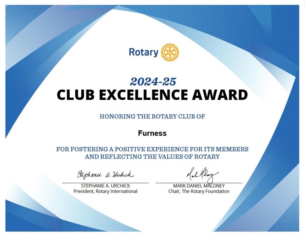 The Rotary Club of Furness is proud and delighted to receive the Club Excellence Award from Rotary International.