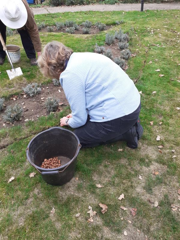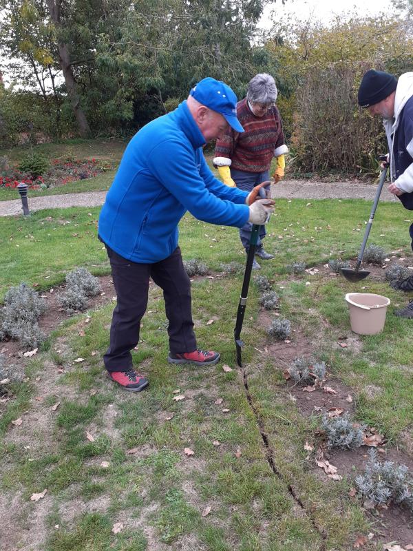 The Rotary Club of Milton Keynes Grand Union has played its part planting purple crocuses in past years, and in the last couple of weeks members of the club, helped plant a display of 4000 purple crocuses in the grounds of Willen Hospice in Milton Keynes. They were helped by Tom Burchmore, the Willen gardener, and after around 90 minutes of hard work, all enjoyed coffee in the Willen cafe.