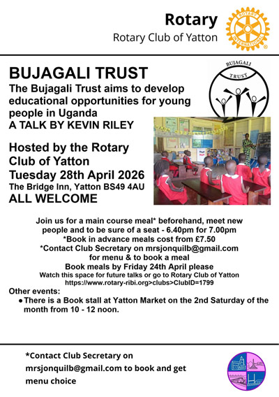 The Rotary Club of Yatton invites you to our next Free Talk taking place on Tuesday 28th April evening at the Bridge Inn, Northend Road, Yatton. Kevin Riley Chair of the charity Bujagali Trust will give a talk about their work in Africa.