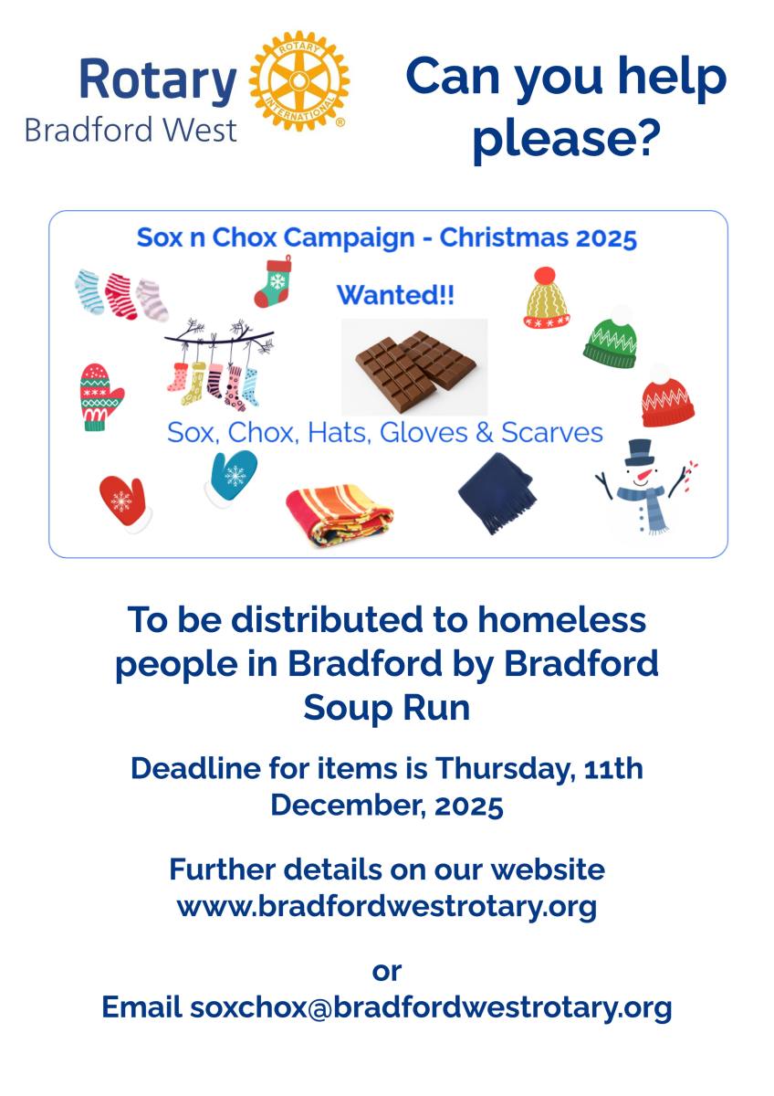 We have again been asked to coordinate and collect warm socks, hats, gloves, scarves and bars of chocolate for homeless people in Bradford. Last year, you did an amazing job and we collected an incredible number which were distributed directly to those in need via the Bradford Soup Run.