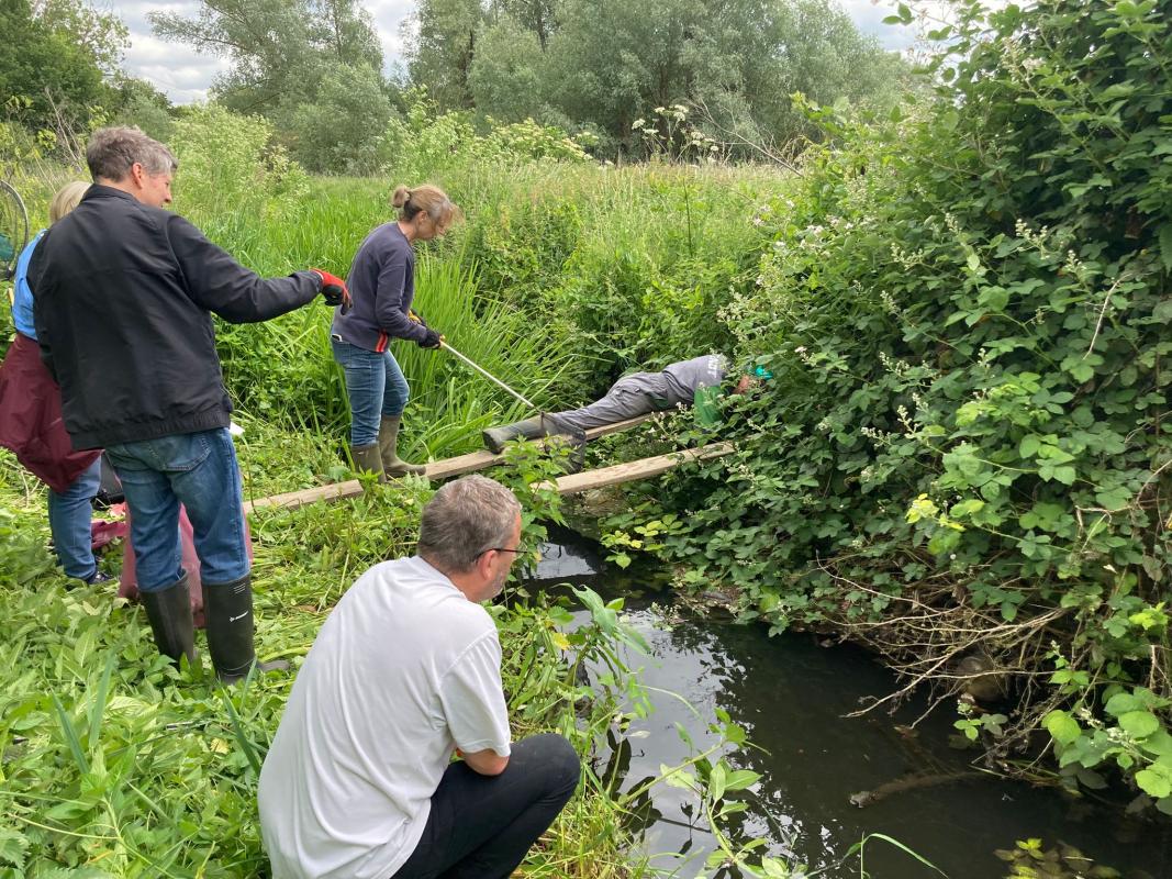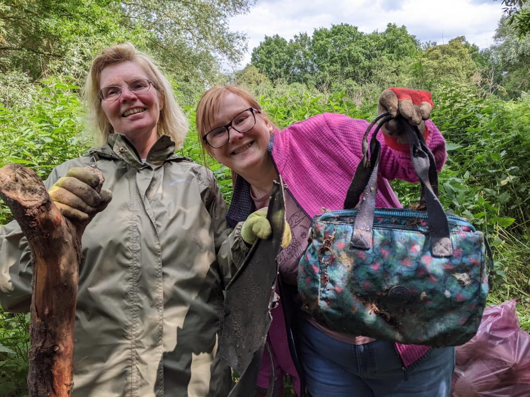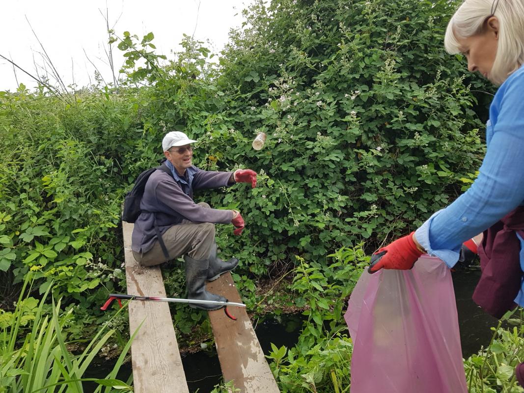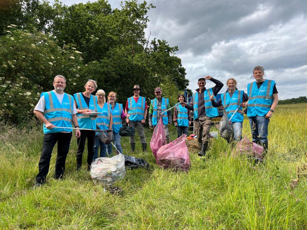 Club members on a sunny day on the banks of the River Brain with plastic bags full of rubbish