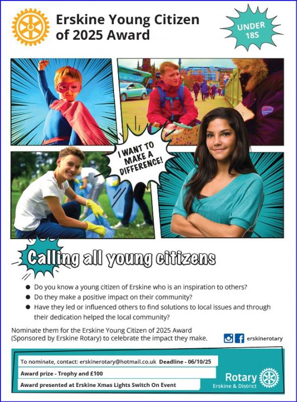 The moto of Erskine & District Rotary is Service above Self as we work to fundraise and offer our time to our local community and local charities, so your nominee should be a young person who has acted selflessly in giving of their time or fundraising to make life better for either individuals, groups or the whole Erskine community.