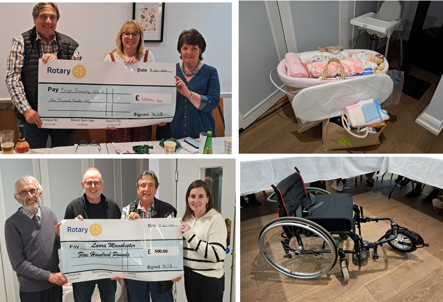At the same meeting as the Moses Project presentation, a cheque for £500 was awarded to Laura Manchester, foster mother to a disabled young man. The donation has been used to purchase a front wheel attachment for his wheelchair, enabling him to travel over rough terrain and enjoy more outdoor activities. In the accompanying photo, Laura (far right) is seen receiving the cheque from three of the donors: Guy Wiltshear (Mid Suffolk Rotary), Steve Fenning (Forge Church), and Robin Twigge (Rotary Club of Harleston).
