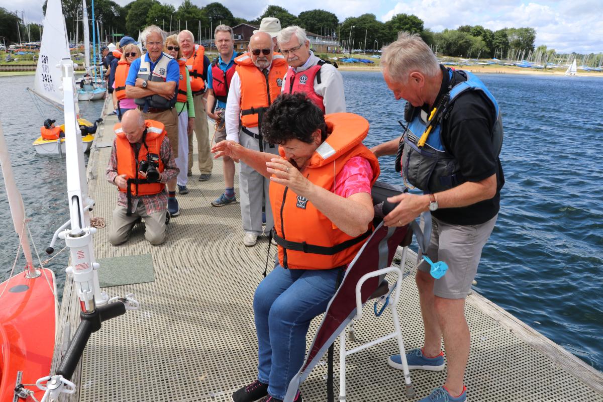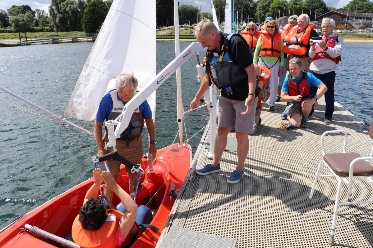 On Thursday 24 June a good number of Uppingham and Rutland Rotarians gathered at Rutland Sailing Club, Edith Weston, to witness the handover of our latest personnel hoist to Rutland Sailability. After a short talk on the activity of Sailability by the Sailability Chairman (and D1070 District Sailability Champion) Andrew St John we all went down onto the jetty to witness the hoist in use. This year the chosen victim was Jayne Bryers who was duly delivered trussed and packaged in to one of the 303 dinghies lying and alongside before she set out on a demonstration sail with Andrew. Later that morning, as the wind increased 3 Rotarians, Liz, Shane and Gerard, received advanced instruction in capsize drill when their Drascombe Longboat capsized in the bay. Sailablity was thus enabled to demonstrate their immaculate emergency procedures!