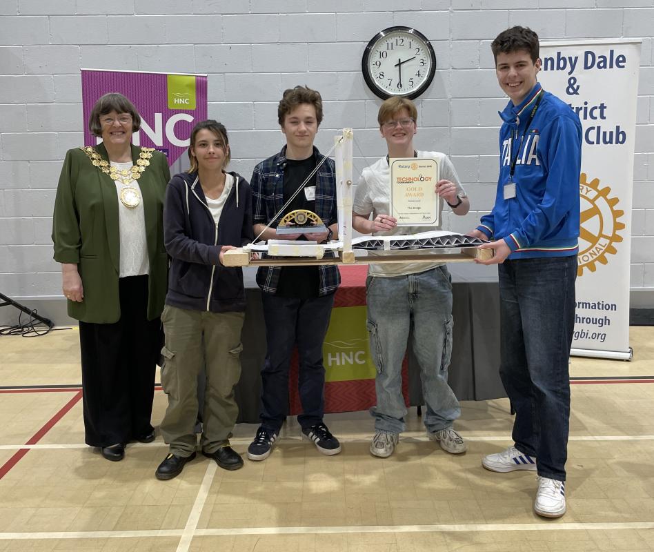 The annual technology tournament took place this year on 20th March 2026 and was held at Huddersfield New College. This event is organised jointly with the Rotary Clubs of Denby Dale and Holmfirth. This year the event was sponsored by Accu Ltd and AMPI and representatives from both companies assisted with the judging. Trophies were designed and printed by NERDHERDRZ using modern 3D printing technology. The task this year was to build and test a Bridge. Twenty-three teams from eight schools took part. Certificates were presented to the winning teams by Clr Liz Smaje, Mayor of Kirklees