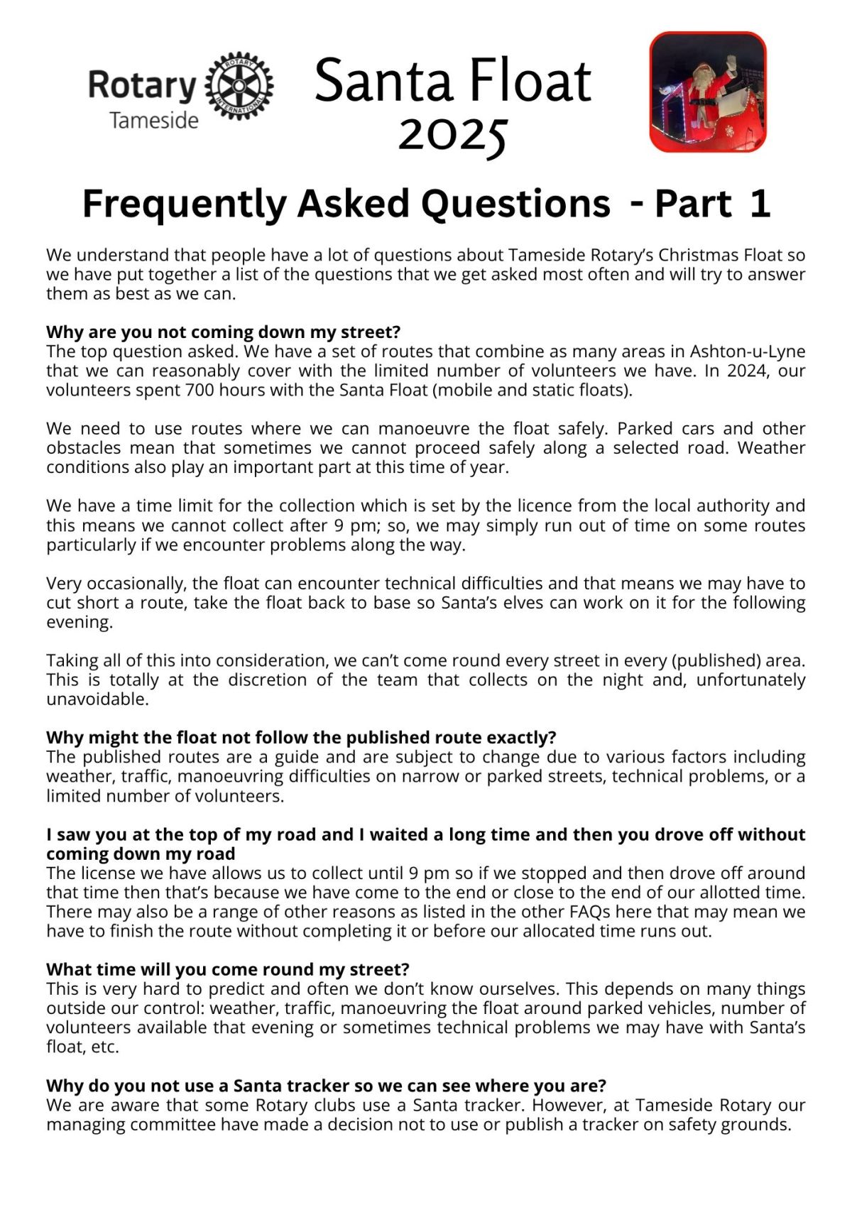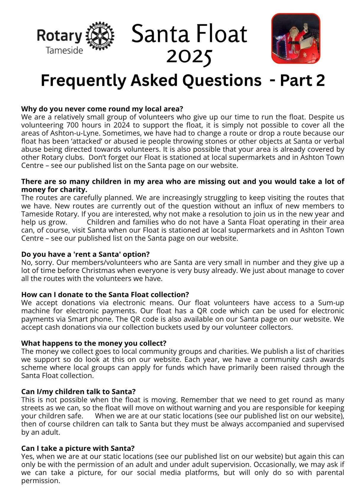 Details of Santa's Plans for 2025 organised by Tameside Rotary