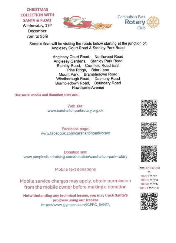Every year we raise £10,000 for our local charities of Carshalton and Wallington. Santa & charity helpers will be out every evening with buckets & card readers bringing joy to our local community. Donate also via our QR code or by text message. Thank you.