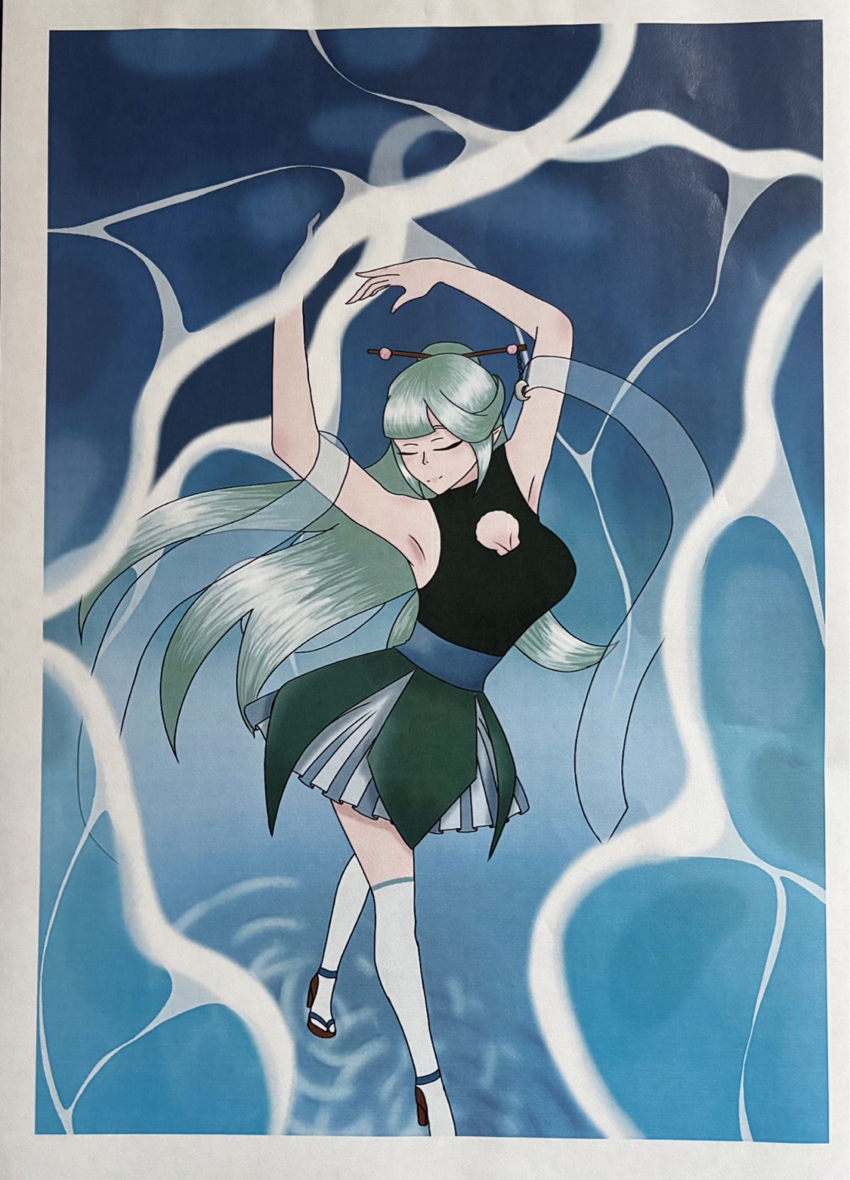Her entry was a computer generated piece. “My art was originally supposed to represent the moon pulling the water in the sea like a dance, but the character slowly drifted away from the idea to then represented both the moon and yourself dancing alongside the water.”