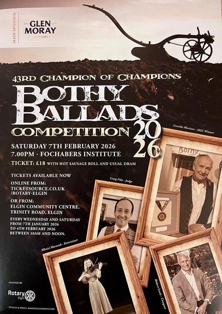 With the Elgin Town Hall temporarily closed for its extensive refurbishment, our 'Bothy Ballads Champion of Champions' event is moving this year to the Institute in Fochabers. It will be held on Saturday 7th February 2026.
