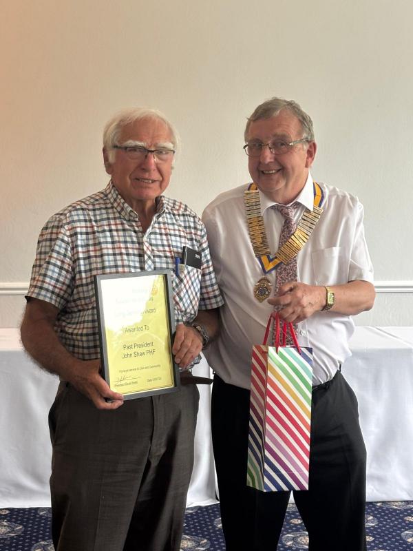 In his handover speech, new President David Smith presented a long service award to Past President John Shaw in appreciation of 50 years service with Newton le Willows Rotary.