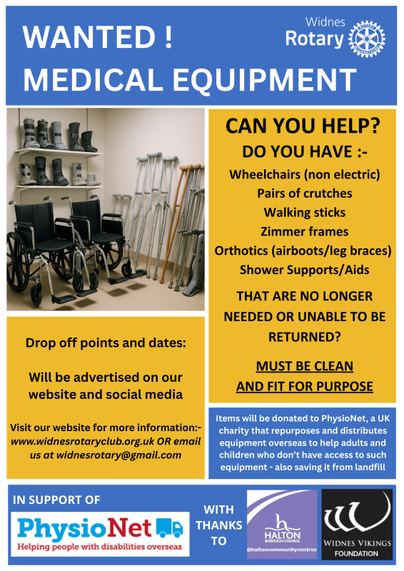 We would also like to thank HBC's Upton Community Centre and the Widnes Vikings Foundation who store the items until they are collected by Physionet, for their help and support.