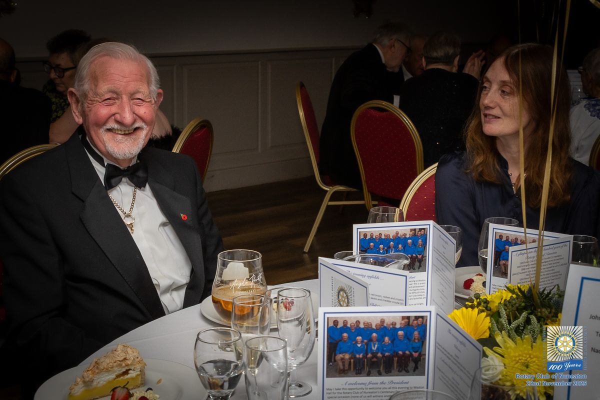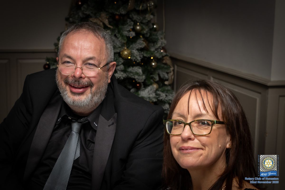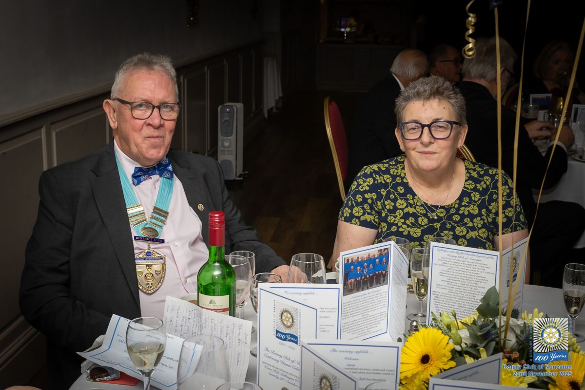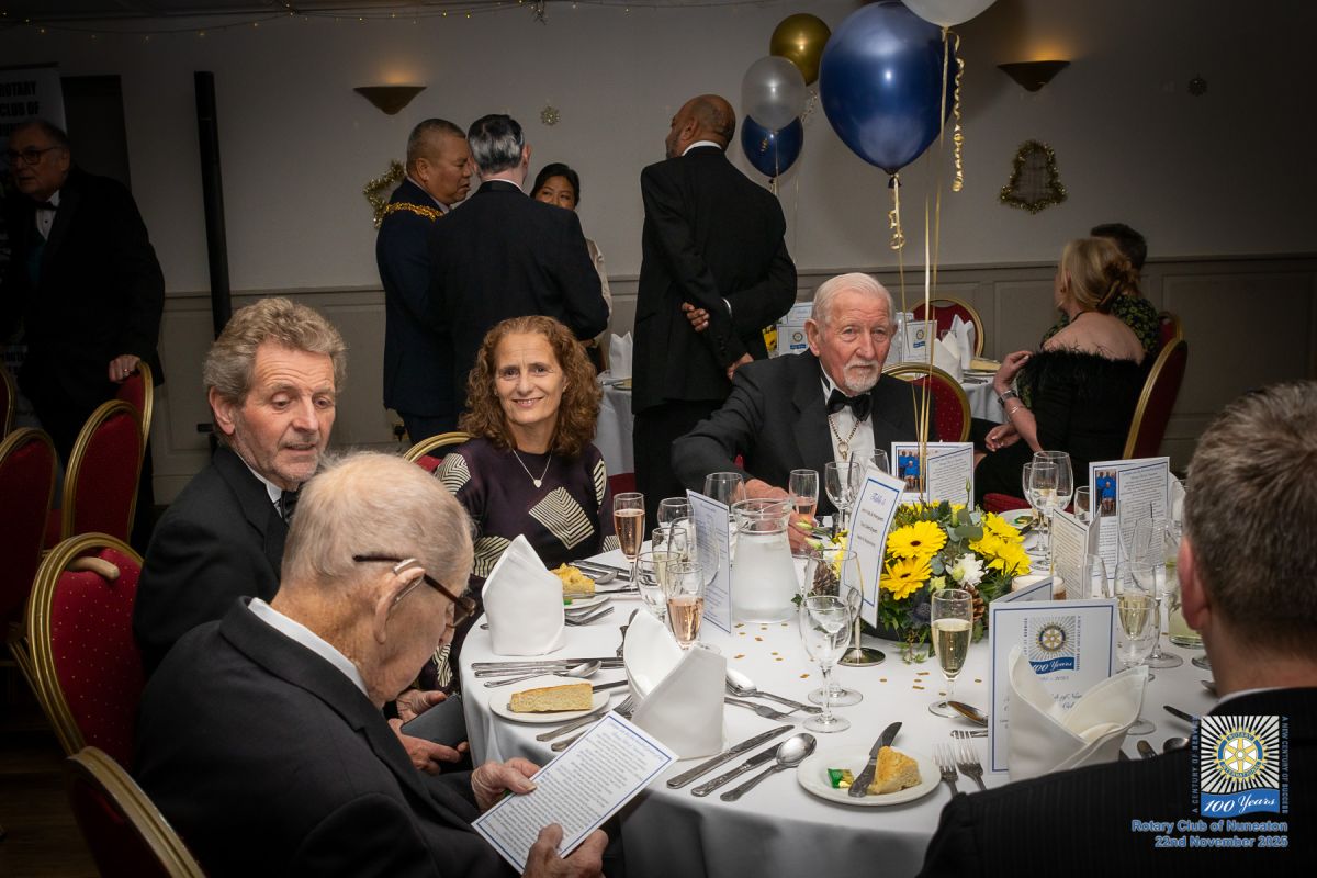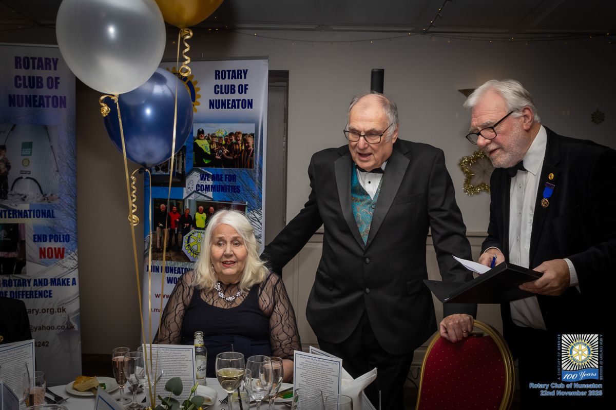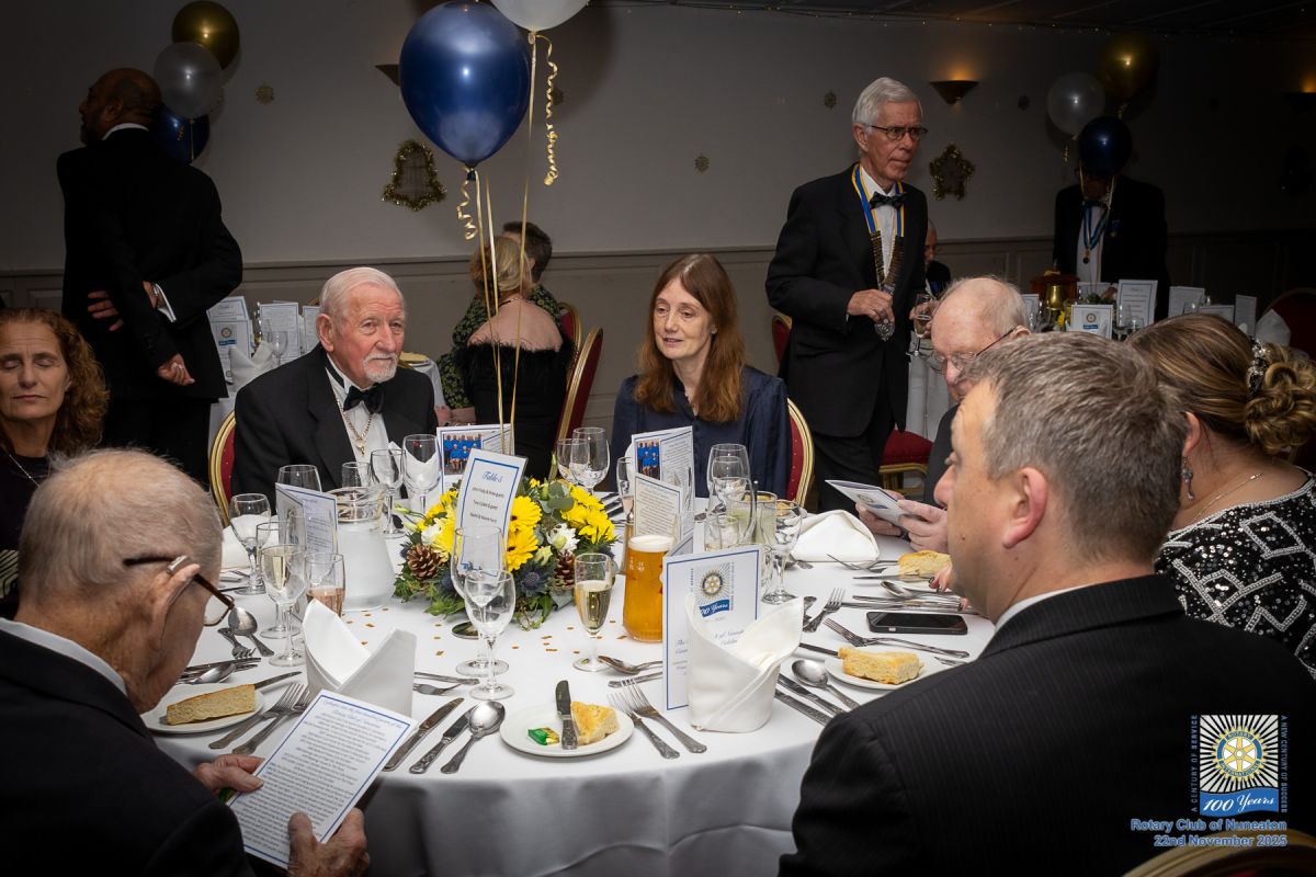 The evening began with a welcoming glass of bubbly before attendees enjoyed a superb three-course meal. President David Lloyd addressed the room with a heartfelt speech, recognising the profound contribution Rotary has made to Nuneaton and North Warwickshire over the past 100 years. He highlighted standout events from this milestone year, including the Matt Ford Concert and the Unsung Hero Afternoon Tea, and shared thoughtful reflections on what the club’s founder members might think if they visited today.