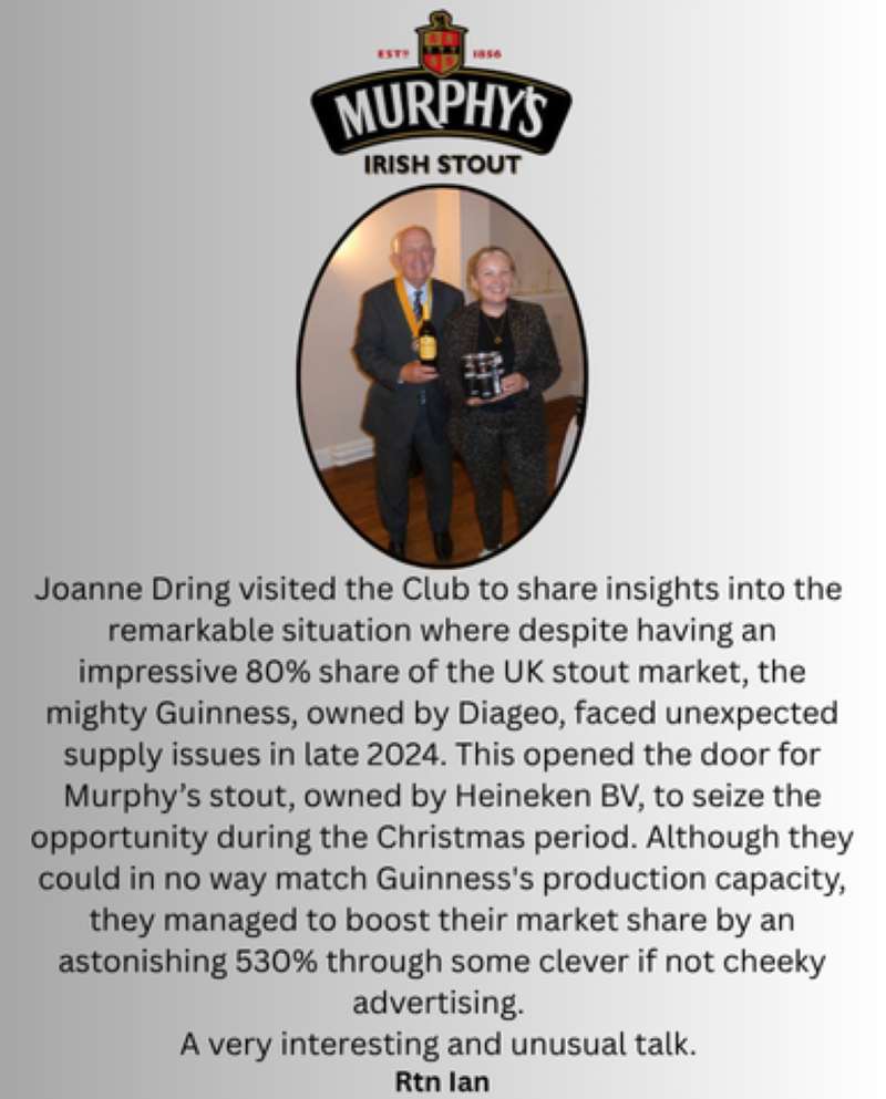 The renowned Guinness brand holds a commanding 80% share of the stout market in the UK, yet it is currently facing a significant supply issue. This evening, our speaker Joanna Dring will provide valuable insights into the recent shifts in market dynamics.