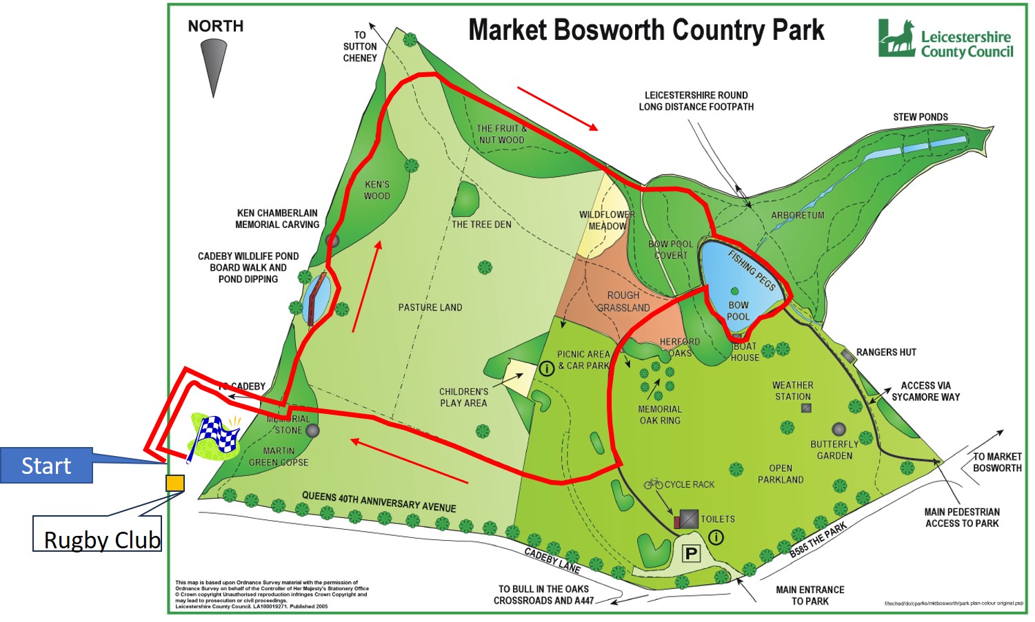The Fun Run will take place in the glorious surroundings of Market Bosworth Country Park but the start and finish points will be at the Rugby Club on Cadeby Lane.