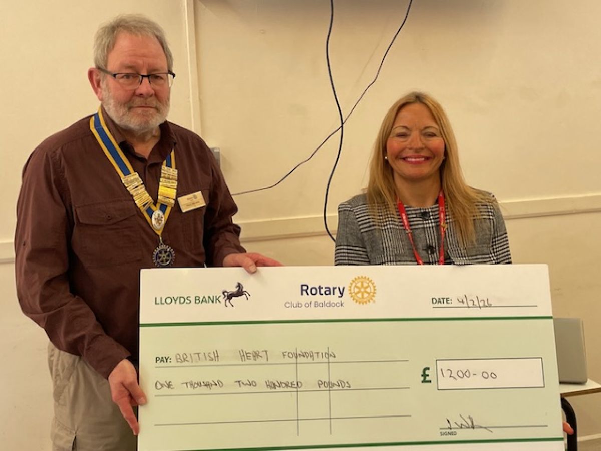 Baldock Rotary Club members were pleased to welcome Nicola Reavey from the BHF to our recent lunch meeting and to present a donation of £1200 from the jazz concert to help the work of this important charity.