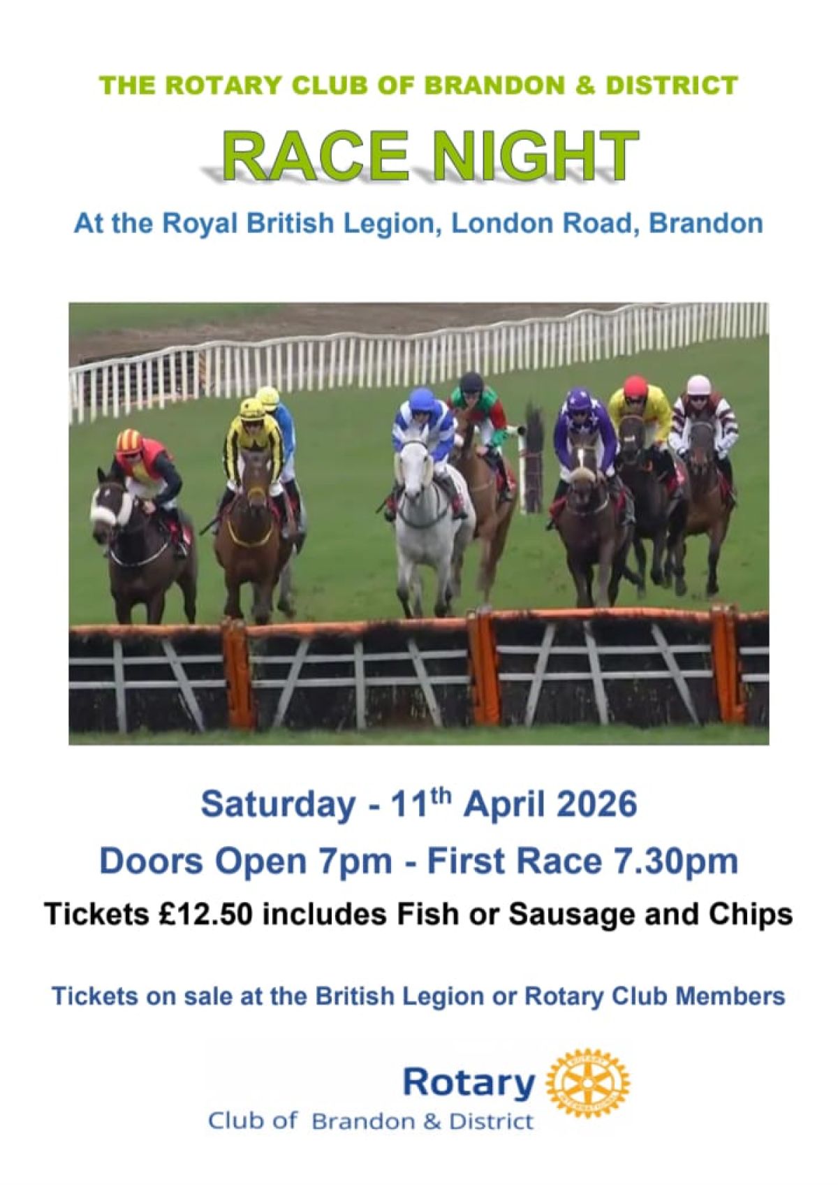 A night at the races to raise funds to support local good causes. Tickets cost £12.50, (which include a fish or sausage and chips supper), are available from Brandon British Legion.
