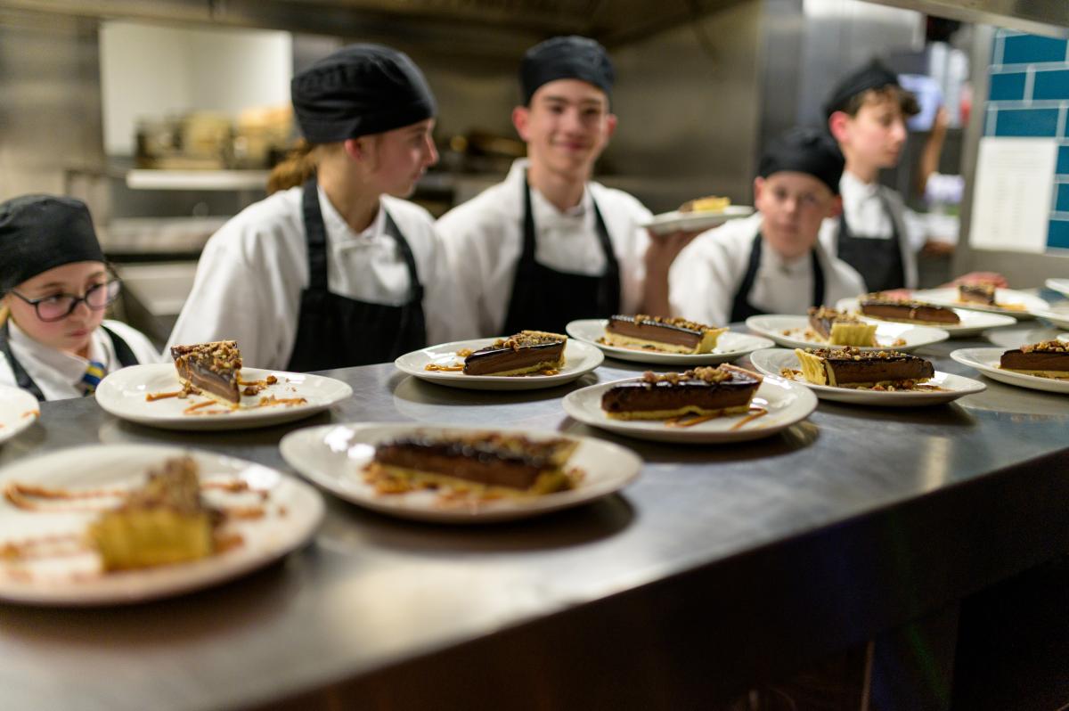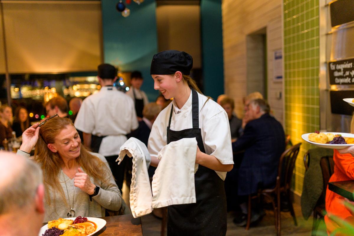 This year the students were learning how to prepare a Christmas menu under the watchful eye of Chef Preston and Chef Mathew. In week-1 it was Chocolate & Pecan Torte. Week-2, Yorkshire puddings, cranberry sauce, swede & carrot mash and freshly made stuffing. And Week-3, spinach and mushroom wellington, sprouts with chestnuts and bacon, and sticky red cabbage. Ready for main event in week-4, when they put it all together to produce and serve an excellent two course meal.