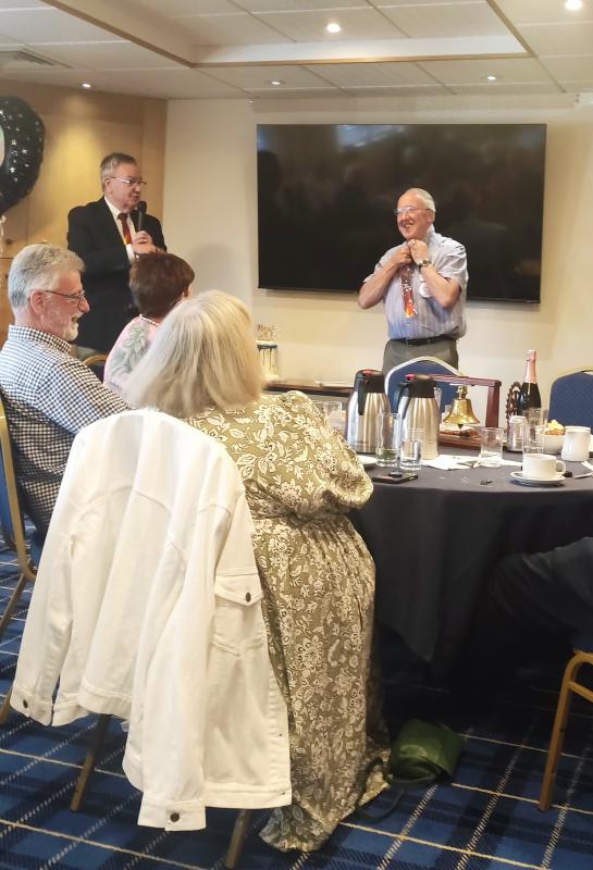 The celebration was joined by the Past President of Rotary International (2023-24), Gordon McInally who presented him with a special neck tie. President Beverley Callander presented Hamish with a trophy, certificate, champagne and a cake.