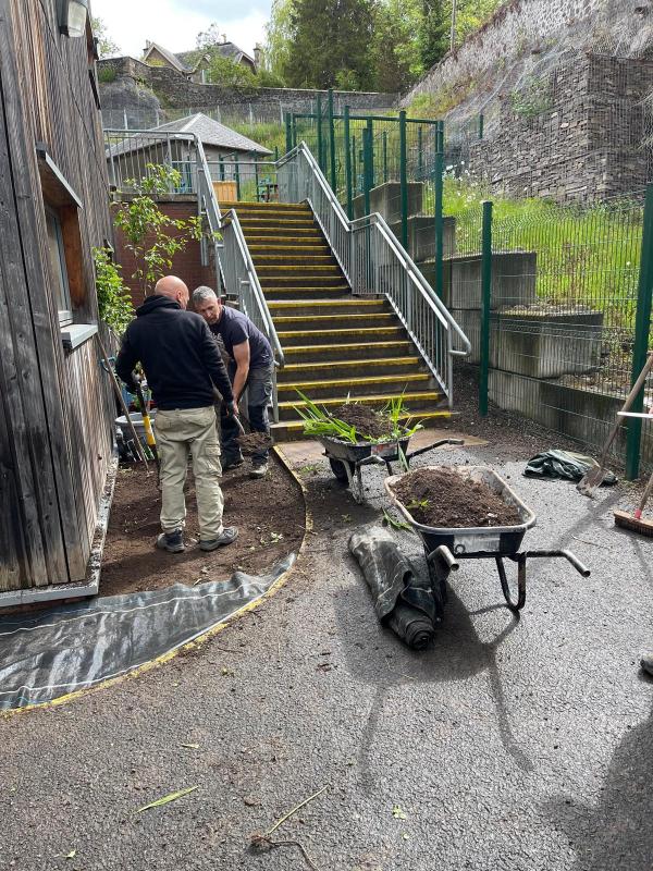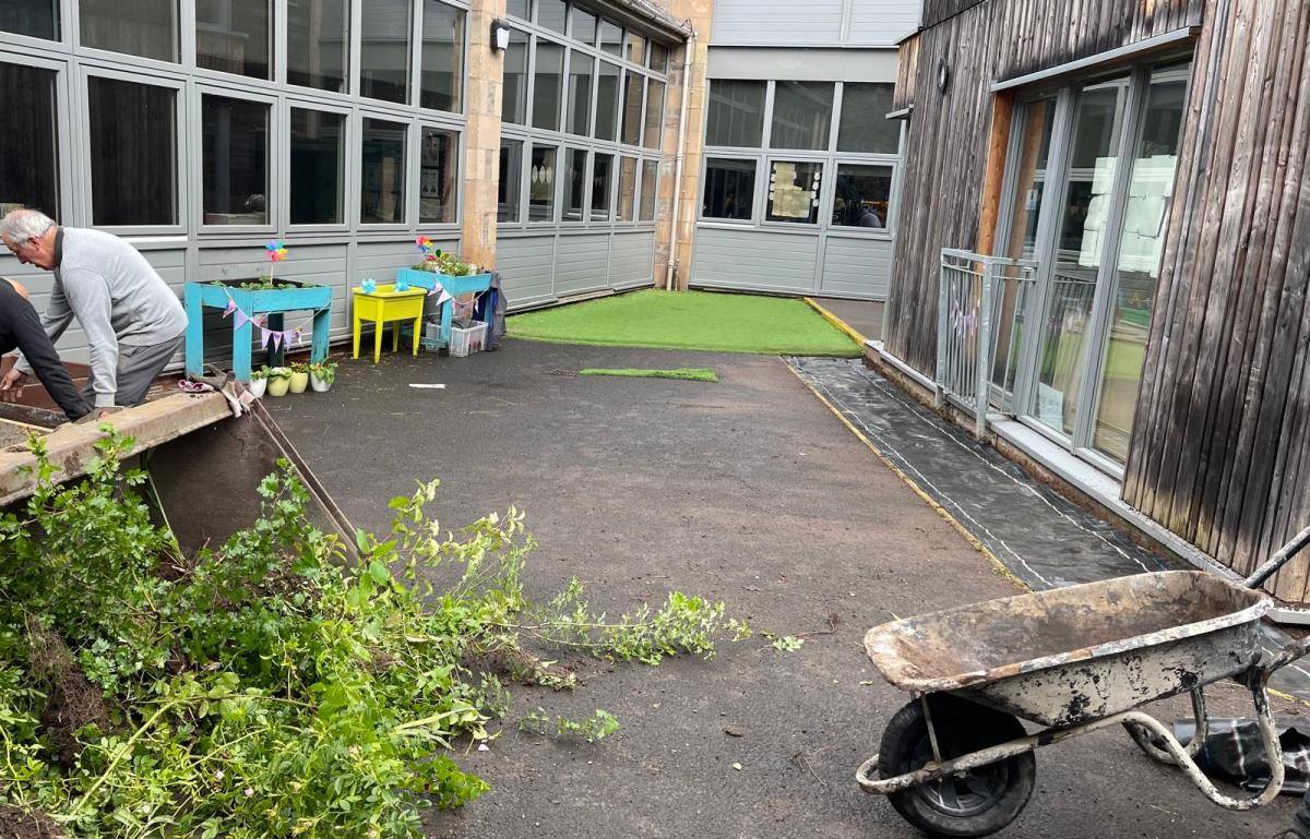 Sunday, 1 June saw a small team of folks descend on Kinnoull Primary School to do some work in their playground. For those of you not familiar with the school, it was built in what had been a quarry and has very limited green spaces and is surrounded by huge rock walls. The RotaKids, as part of their community project, were keen to try and brighten up the space and where possible have some more plants etc. As a starter, our Club decided to give them a helping hand and give their plans a bit of a boost.