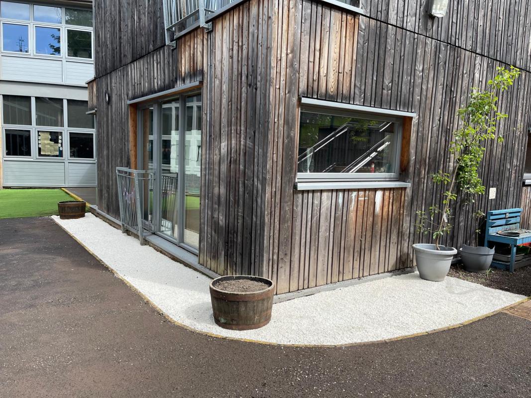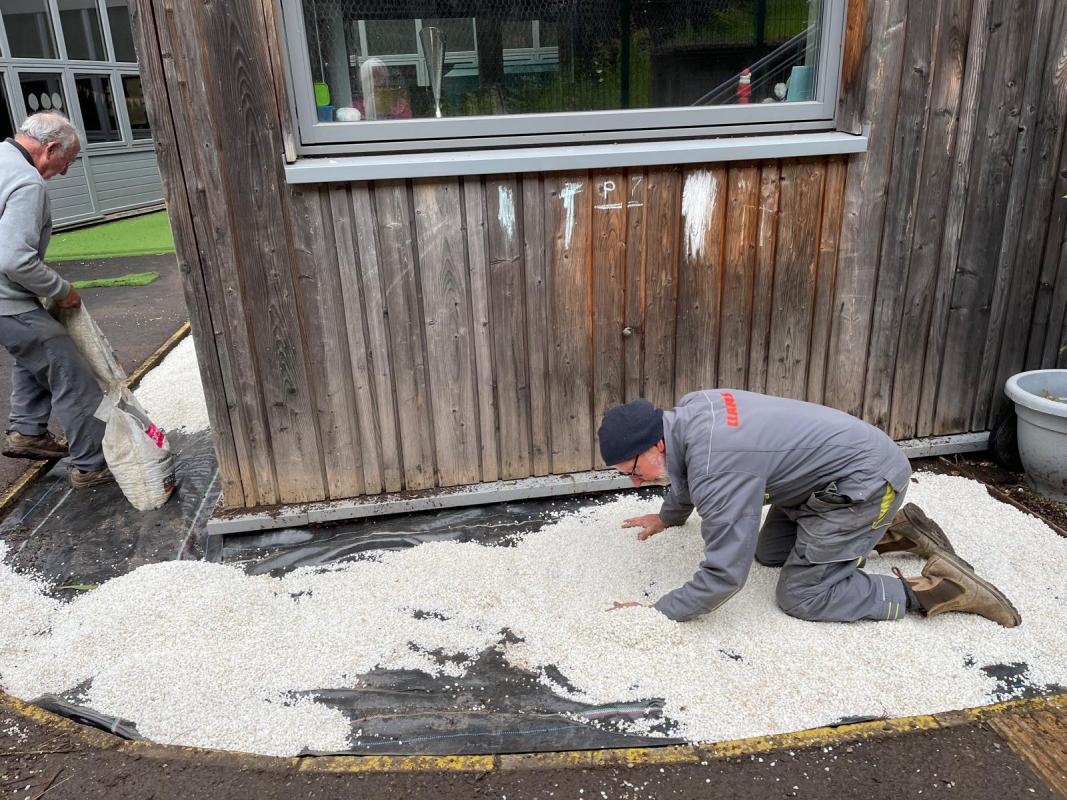 None of this would have been possible without the considerable help of Alistair Ritchie, his son Jim and another of his pals. And boy did they come in all guns blazing! Arriving at the playground on Sunday morning we were greeted with a small, JCB, a trailer, a small digger and bags of stone chips, 4 large whisky barrel planters and a couple of picnic tables! Absolutely unbelievable! Within a couple of hours a small border had been transformed from a dull, weed covered area to a bright border complete with two soil filled planters ready for the pupils to plant up! Two other planters were also brought in and placed along a wall of the building again giving another opportunity to plant up and brighten up the space.