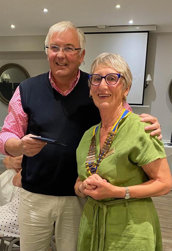 Outgoing President Mike Stamford hands over to Incoming President, Anna Cottrell at the start of a new Rotary Year 2025-26.