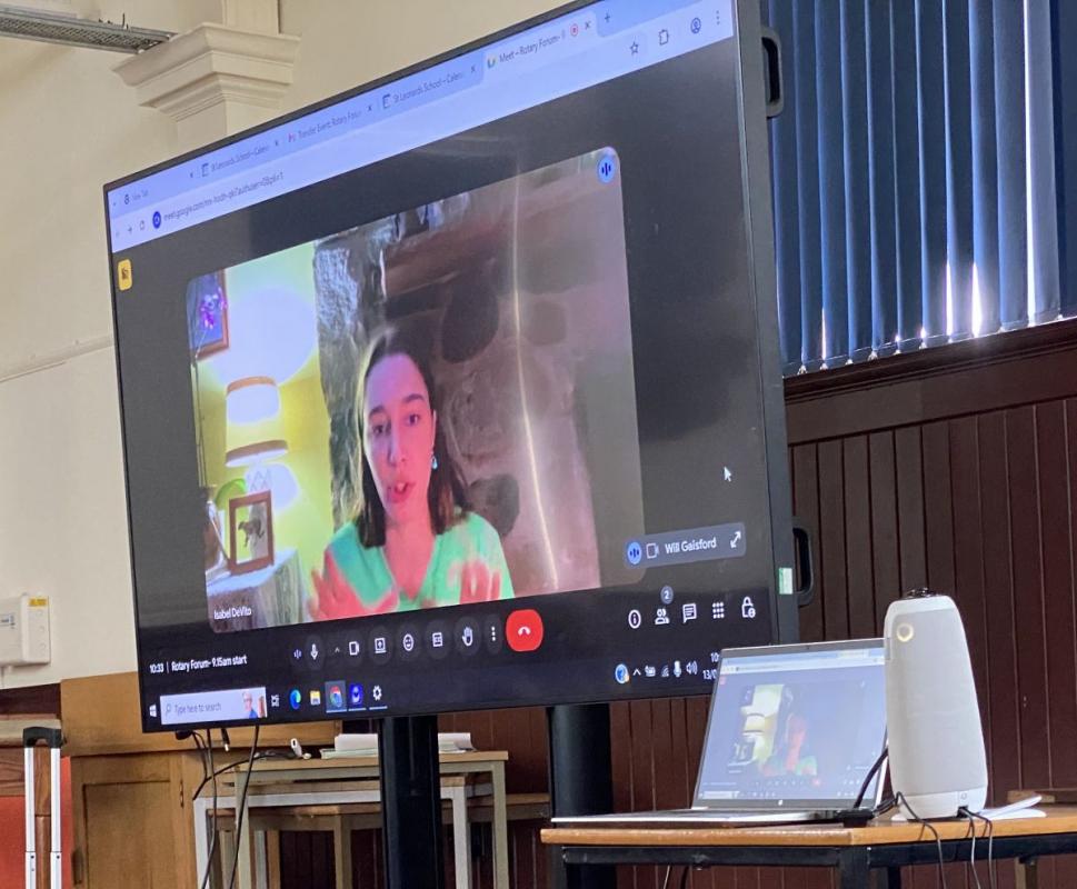 more Maddie Fuller was elected President after delivering her presentation from Spain on FaceTime. Past President Keertna tries to hang the chain of office over her neck!