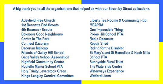 We are extremely grateful to our collector organisations who helped with each street by street route and our Friends of Rotary who assisted with the static collections.