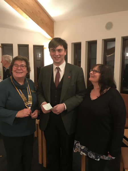 This year's Club President, Jenny Owen, presents Tom with a cheque to help him with his efforts whilst his mother keen for him to succeed looks on.