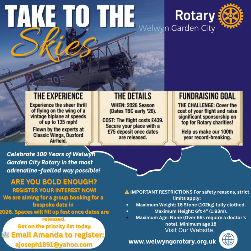 2026 marks the Centenary Year of the Rotary Club of Welwyn Garden City. To celebrate 100 years of service to our community, we are inviting you to take part in our most daring fundraising challenge yet: A Charity Wing Walk.