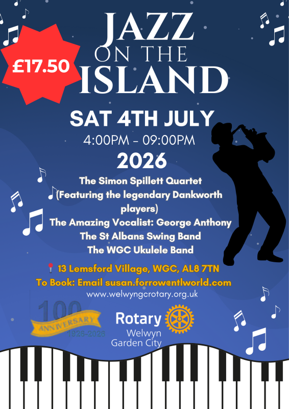 The Rotary Club of Welwyn Garden City is thrilled to announce the return of our spectacular summer musical event, Jazz on the Island. As part of our landmark Centenary Year (1926–2026) celebrations, we invite you to join us for an afternoon and evening of world-class jazz, swing, and fellowship.