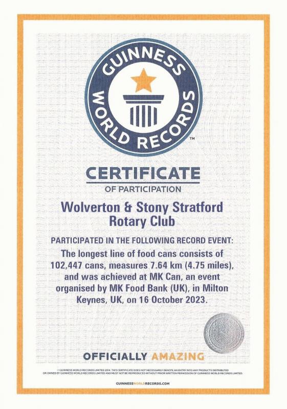 Wolverton & Stony Stratford Rotary Club was very pleased to take part in this challenge to support a very deserving cause. Each participating organisation signed up to collect a minimum of 350 cans and set these out in allocated 25 metre lines, forming a continuous single line of cans snaking all over Campbell Park. Our own club tally was 504 cans, well in excess of the minimum requirement.