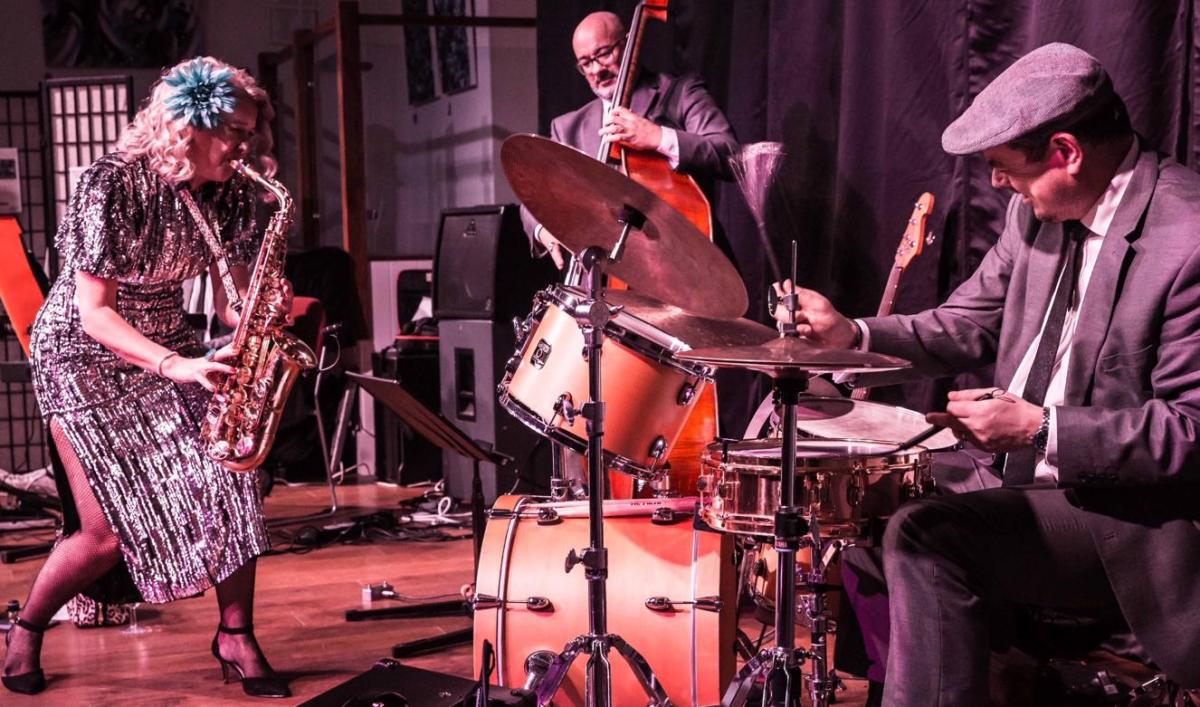 Kim Cypher https://kimcypher.com/is a saxophonist, vocalist and composer with husband Mike on drums