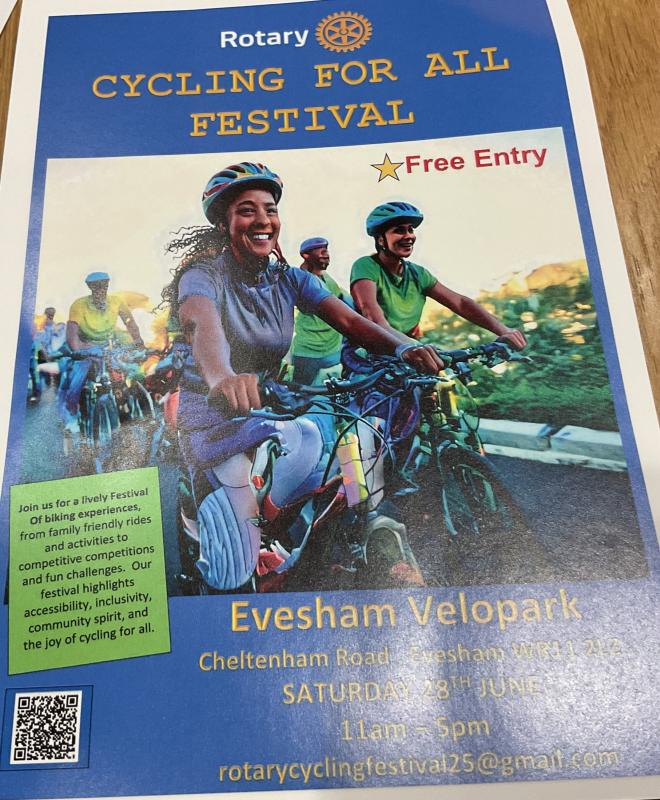 moreBeing put on by the Rotary Clubs across the area, this is a FREE community event promoting cycling for all ages and abilities, encouraging a healthy lifestyle. The event is at Evesham Velopark on Saturday 28th June from 11am to 5pm.