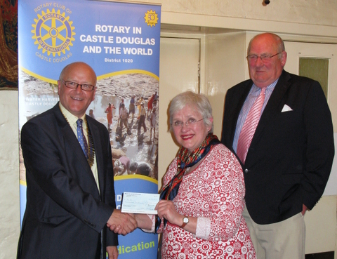 The picture shows Castle Douglas Rotary Club President Derek Crichton presenting Jennifer Tobin, who founded Southwest Scotland RnR, with a cheque for £500. On the right is the Community Services Convener, Andrew Dunlop, who organised the fundraising.