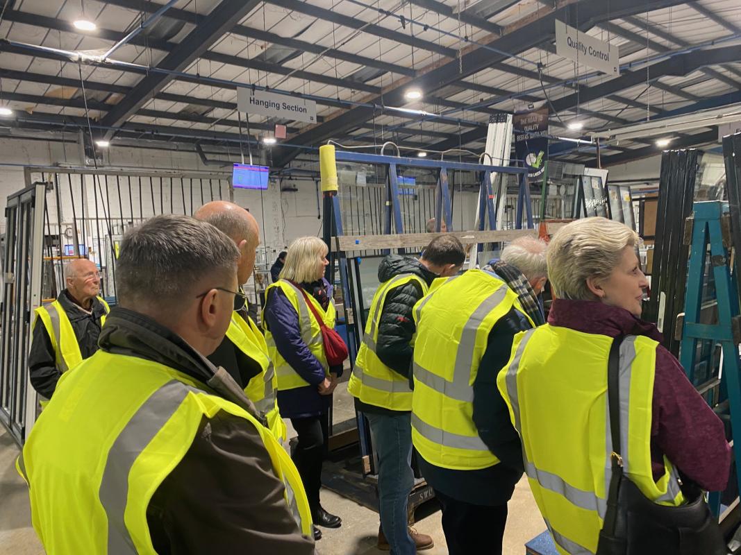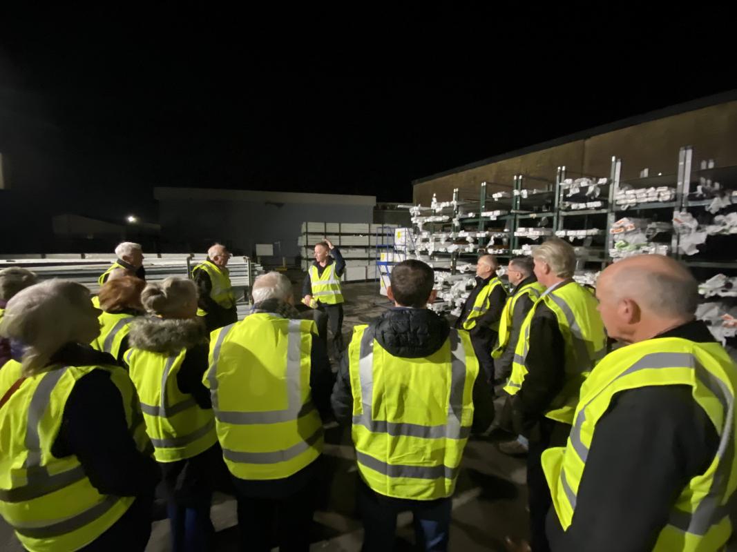 On a damp and dark January evening eighteen intrepid Rotarians and partners headed out to the deepest recesses of Hampden Park, Eastbourne to rendezvous with Paul, Production Director of Whiteline Windows. After our initial talk we were all equipped with hi-viz vests and earplugs to commence our tour around the factory.