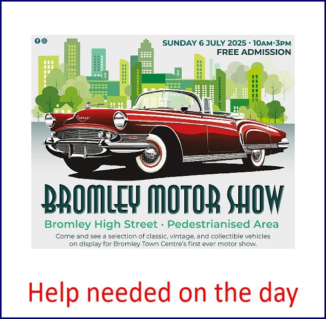 We have been asked if we can help marshalling at this event too so please can you check your diaries and let me know as soon as possible if you can give an hour or more of your time on SUNDAY 6th JULY. It’s happening in the pedestrian bit of Bromley High Street and help is needed from 8am until 4pm (getting the vehicles parked on their sites, ensuring the safety of the public, clearing up….)