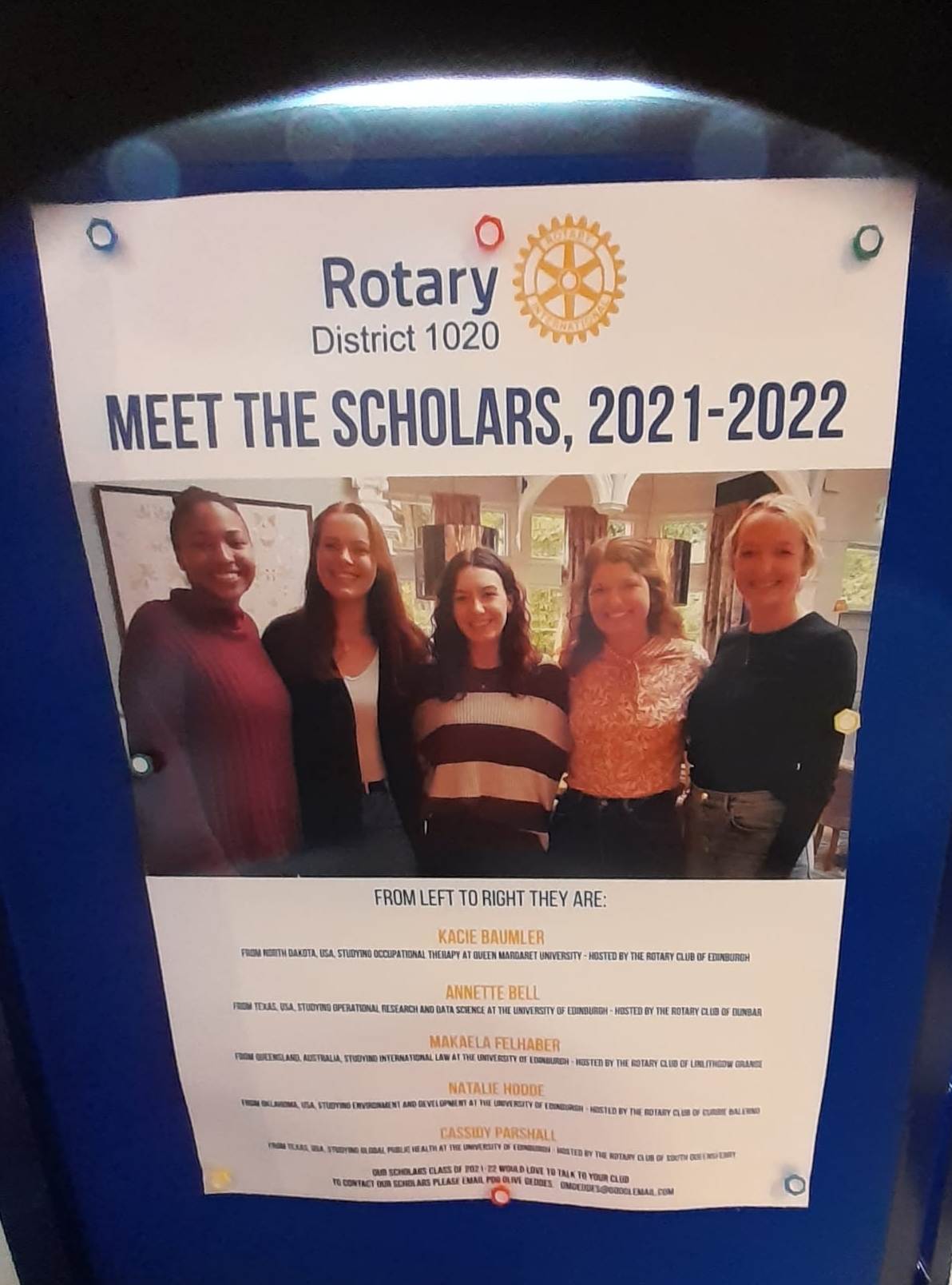 Delegates were then introduced by District 1020 Scholars Liaison Officer, Olive Geddes, to four of the current five District 1020 Visitng Rotary Scholars, two from Texas, sponsored by Currie Balerno Club, one from North Dakota sponsored by Edinburgh Club and the fourth from Brisbane, Australia, sponsored by Linlithgow & Bo’ness Club.