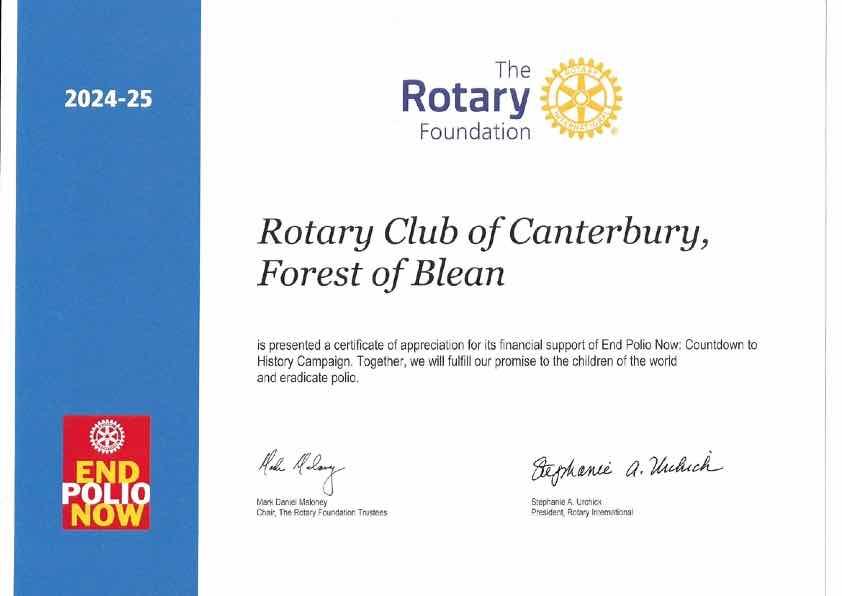 The Rotary Club of Canterbury Forest of Blean is proud to support Rotary Foundation's End Polio Now.