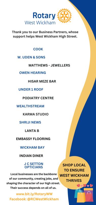 This is a local scheme where businesses, known to Rotary West Wickham (although we do not endorse or support any business or service) support the work carried out by Rotary West Wickham. We in turn let the public know about our partners and what they do.