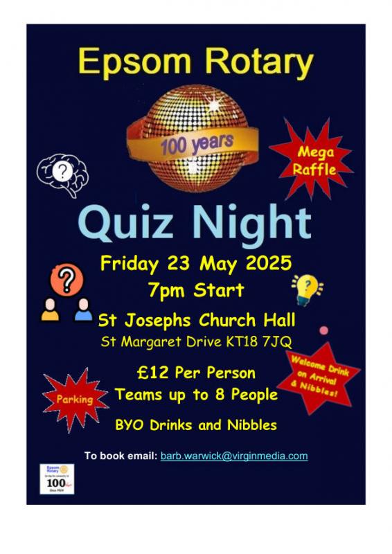 Epsom Rotary is celebrating 100 years of supporting Epsom.  A special quiz night is planned costing only £12 per person and it will be held at