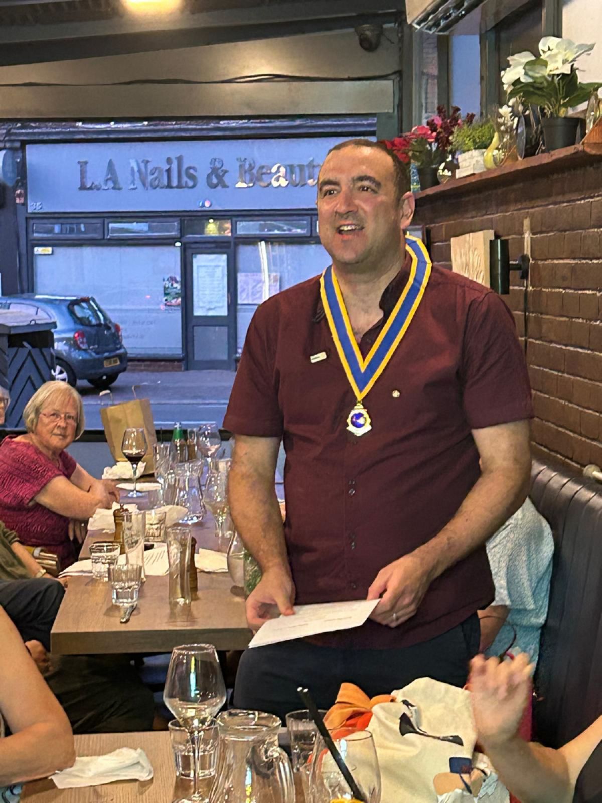 Joe Proops was inducted as the new President of Epsom Rotary on 10th July 2025 at Koza restaurant in Epsom. Past President Jim Munns handed over the chain of office to him on behalf of Past President Carol Caiger and himself, the two Co-presidents of 2024-2025.