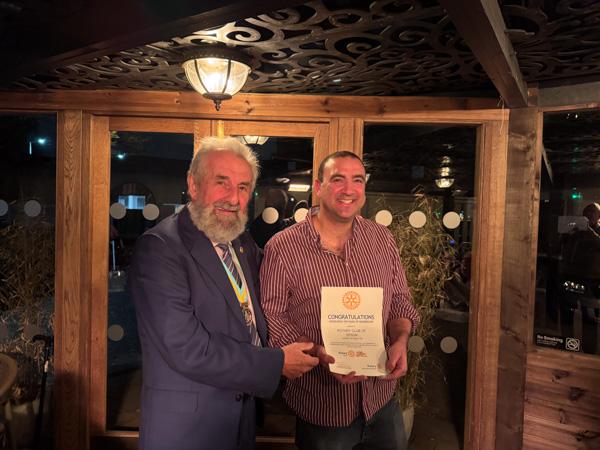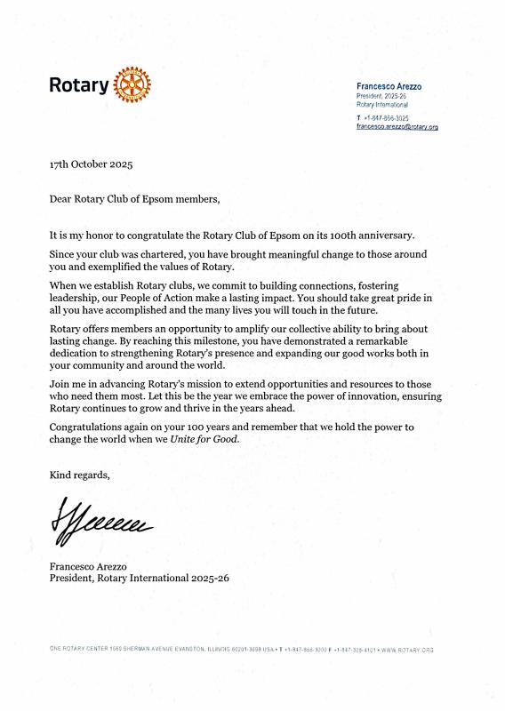 Tony Hamilton, our Assistant Governor, presented a certificate from Rotary International to Epsom's president, Joe Proops, to mark 100 years since our Charter. The Marquis of Granby in Epsom provided the venue and a great dinner. We filled the room and stayed late, reminiscing and planning for our next 100 years. It was a heartwarming evening!