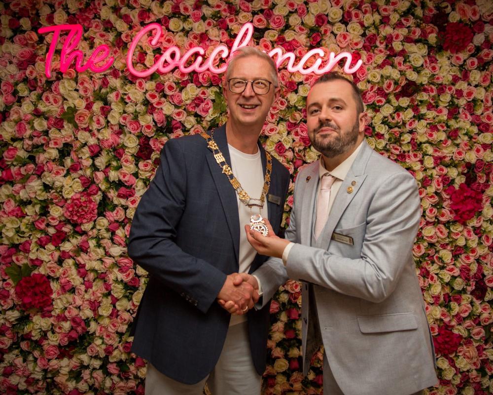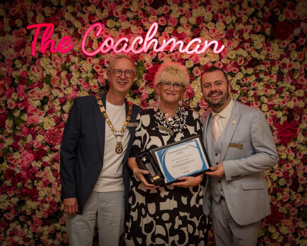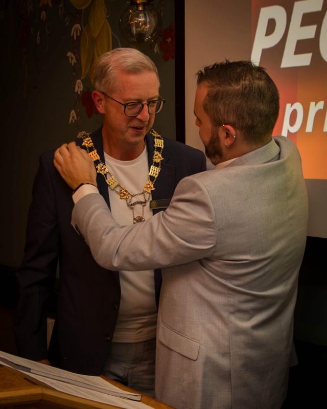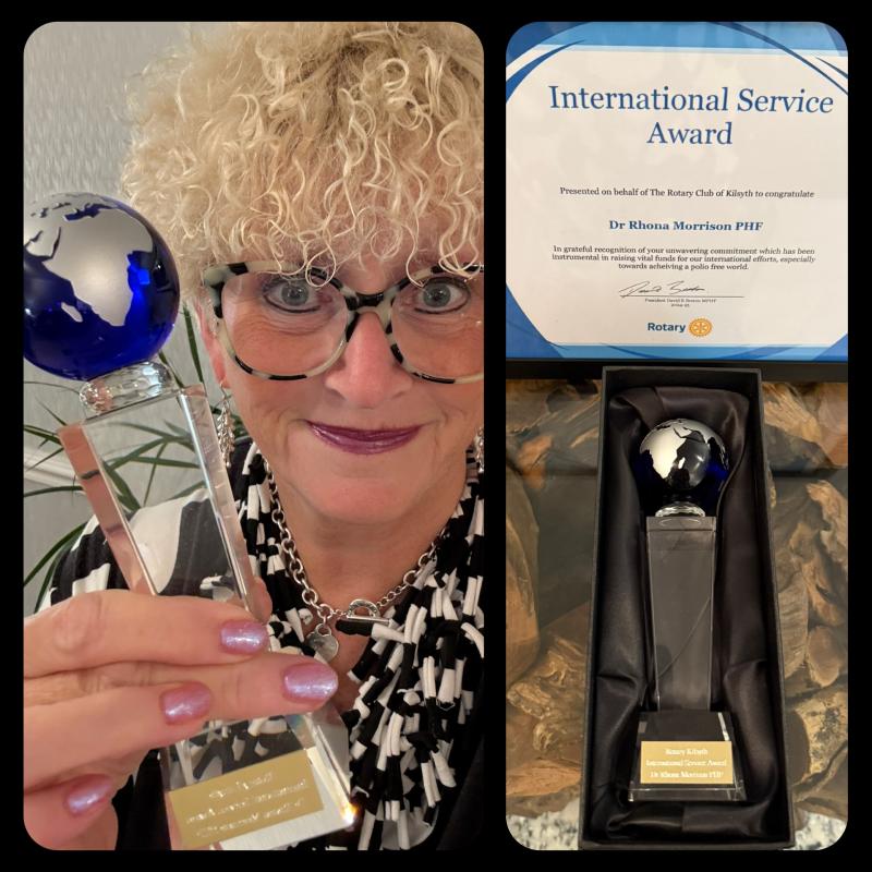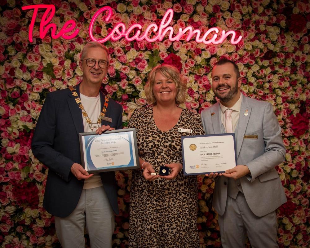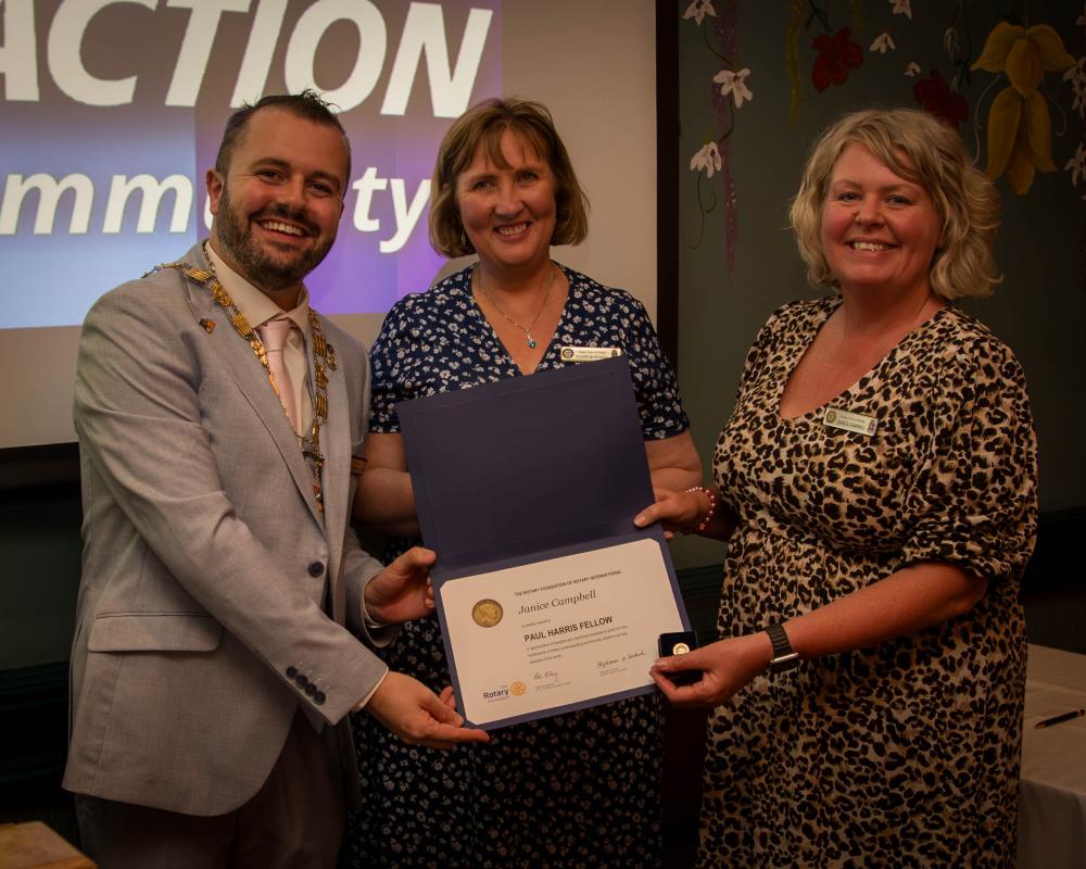 President David passes chain to Mark Davidson, Rhona Morrison is presented with an international award for her fundraising and Janice Campbell becomes Paul Harris fellow and honorary member. Entertainment was provided by Pat Canavan.