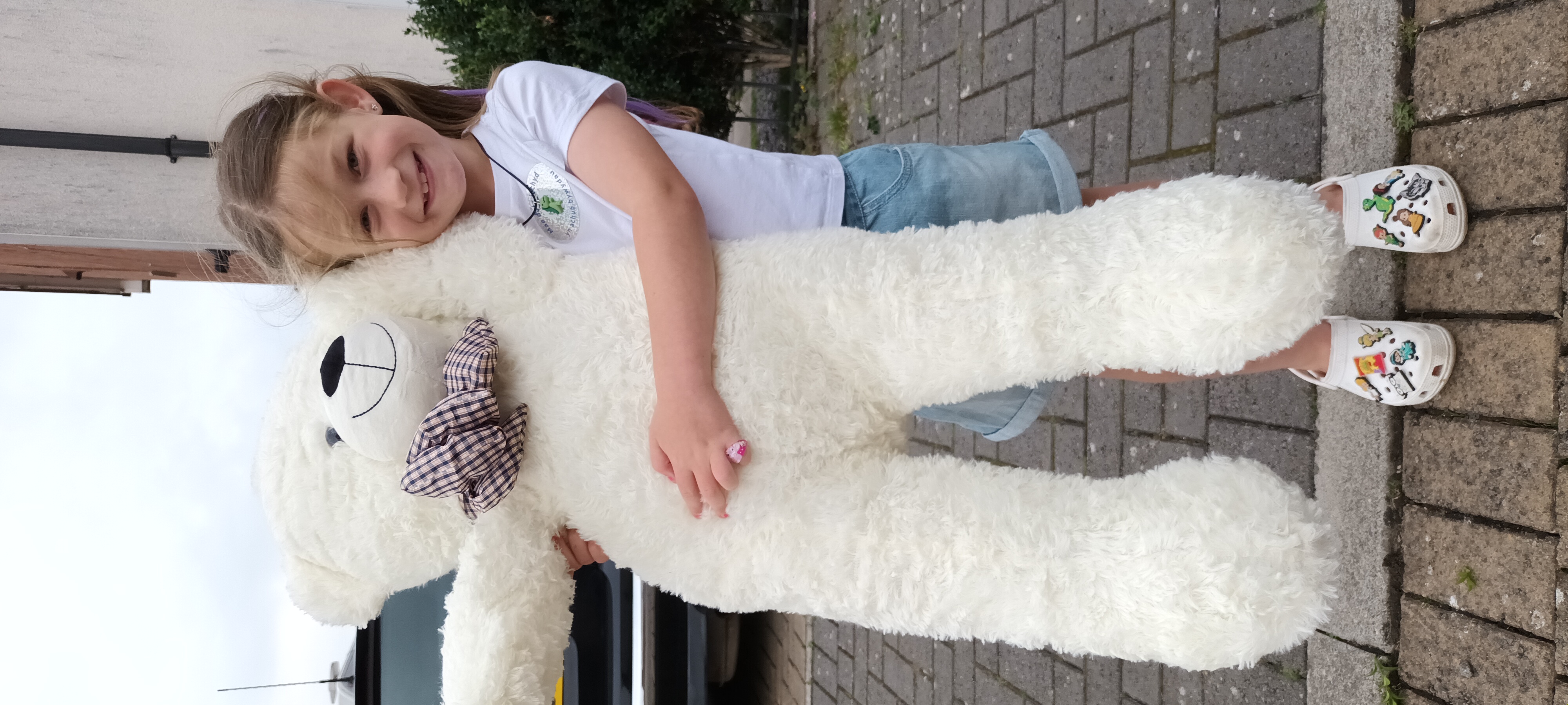 The lucky winner of the "guess the name of the teddy" competition was clearly delighted with her win!