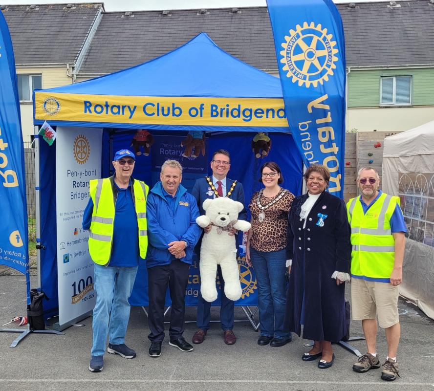 We also has a guess the wieght of the tub of marshmallows, guess the number of sweets in the bottle and guess the name of the giant teddy. The teddy is in the header photo held by Major of Bridgend County Borough Huw David with the High Sherrif of Mid Glamorgan, Sharon Davies, who both visited the Rotary Bridgend stand.