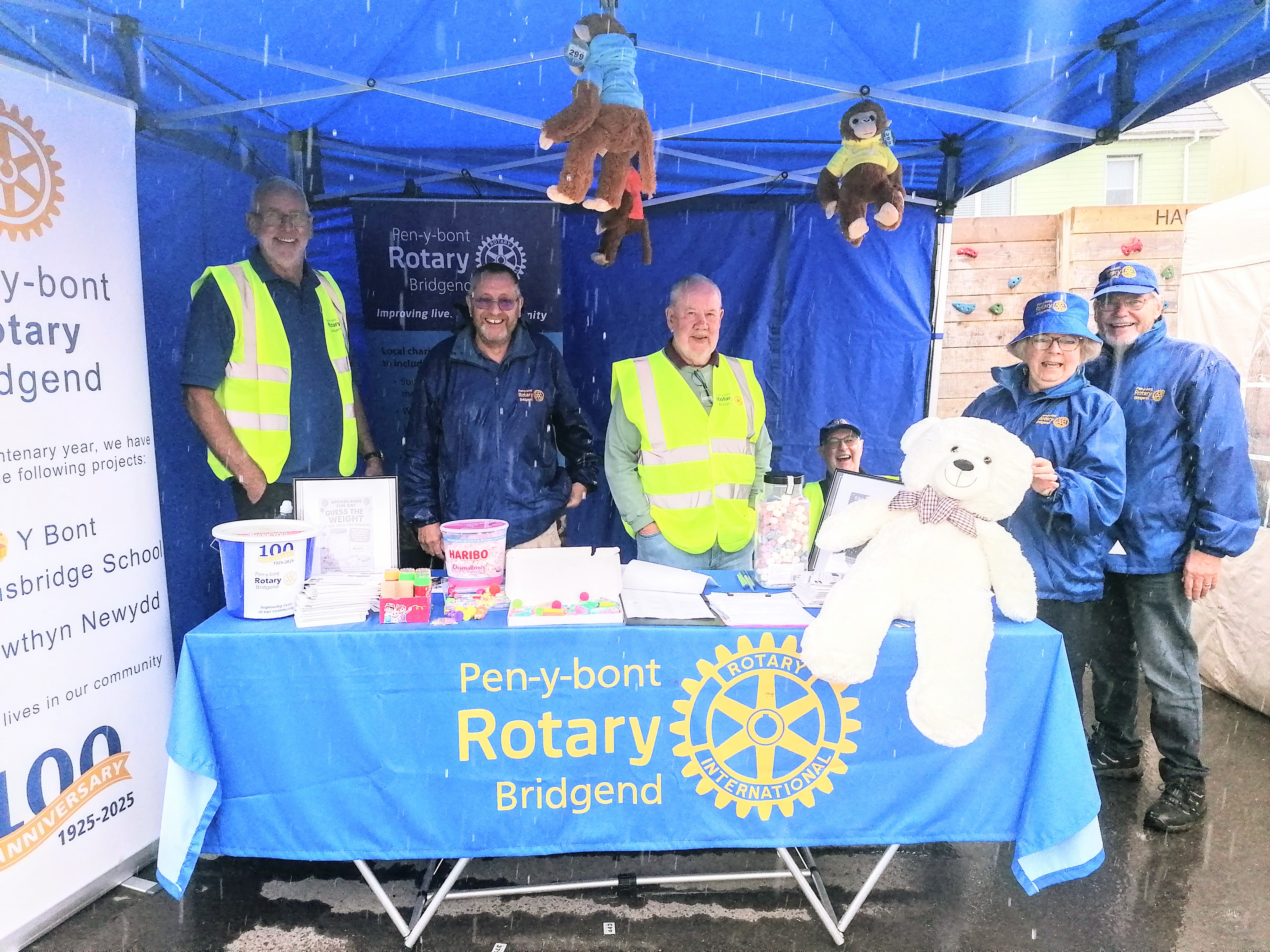 Unlike last year when the weather was fine and warm, this year the clouds opened as can be seen above. Despite this we were pleased to welcome many parents, grandparents and children to our stand and tell them about Rotary Bridgend, our centenary and the projects we are supporting.