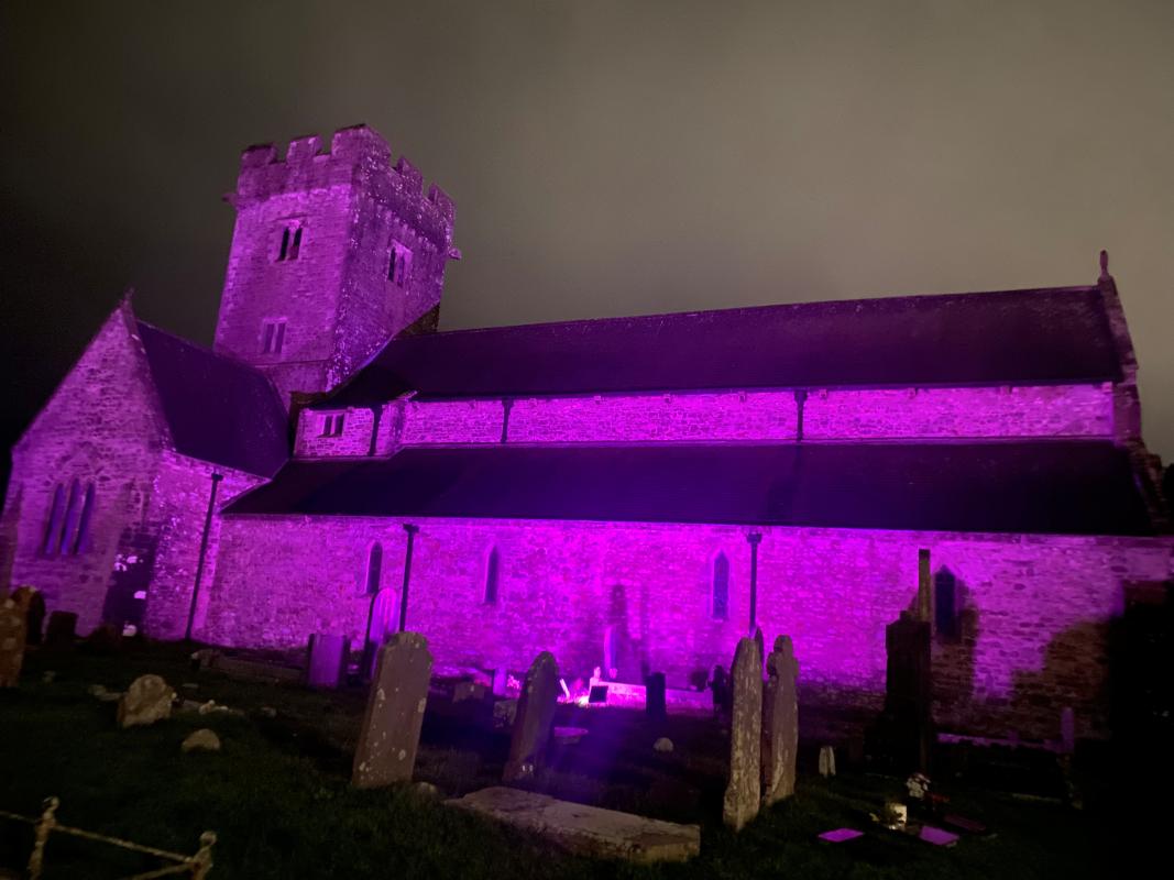 Supporting Rotary's worldwide fight to eradicate Polio, Rotary Bridgend lit up local landmarks, including St Crallo's Church in Coychurch, in purple.